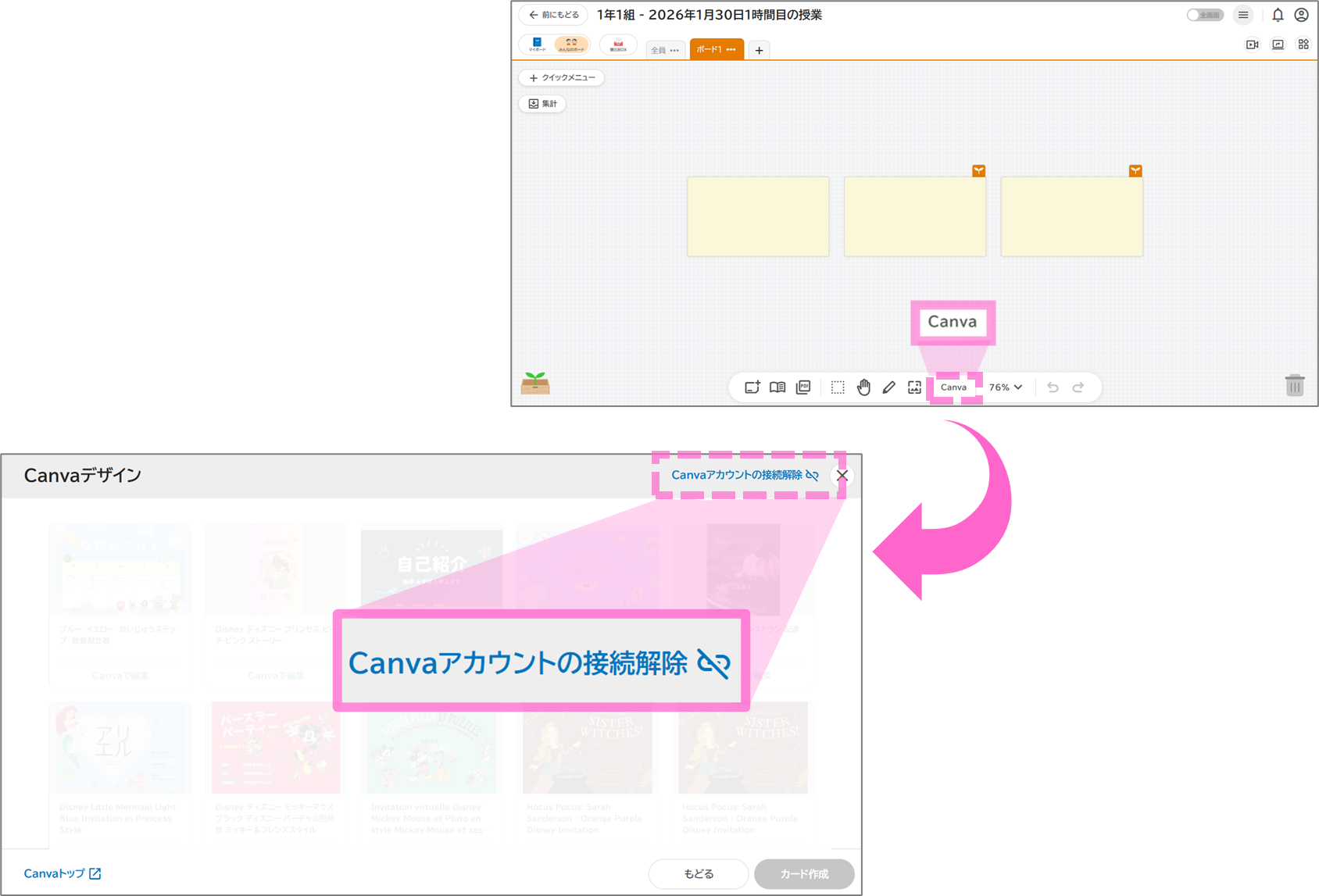 ボード上のツールバーから「Canva」をタップした画面右上の「Canvaアカウントの接続解除」よりアカウントの紐づけを解除することができます。