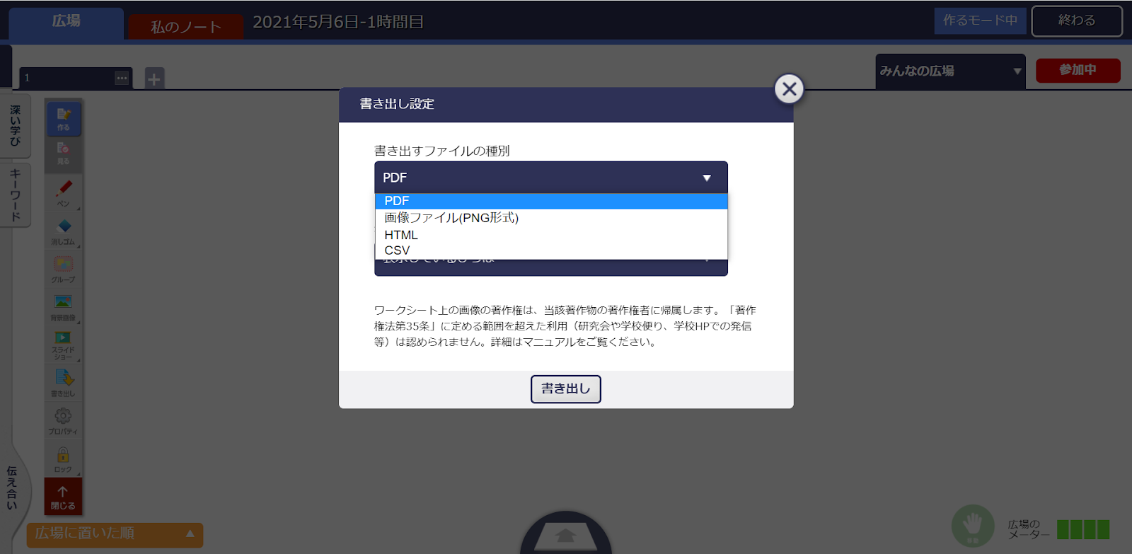 直接印刷することはできませんが、ふたばメニューの「書き出し」から、他のファイル形式で出力したものを印刷することができます。出力できるファイルの種類は「PDF、PNG、HTML、CSV」の4つで、範囲は「私のノート、みんなの広場、私のノートと広場の両方」3つです。ただし、iPadOSの場合は書き出し機能が使えません。