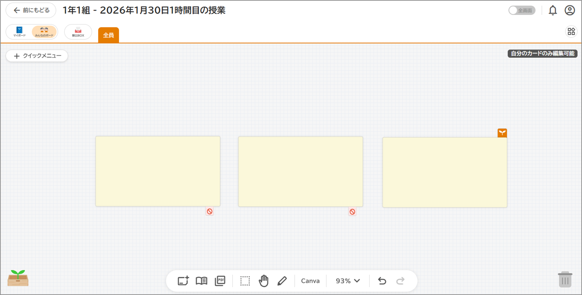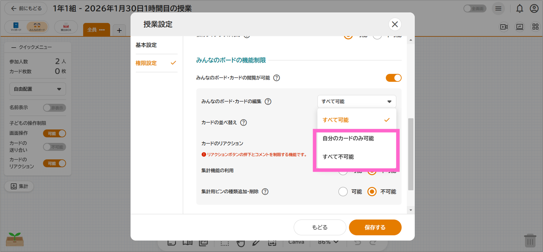 先生画面の授業設定から「みんなのボード・カードの編集」を「自分のカードのみ可能」、または「すべて不可能」にします。